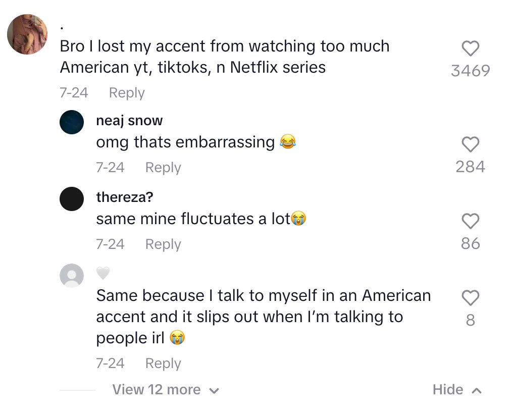 This week, I came across a video where an Australian woman says, "I would never lose my Australian accent," while discussing how another Australian creator has lost his and how she "feels defeated" listening to it. Despite it sounding a bit harsh, people in the comments agree. One user commented, "Bro I lost my accent from watching too much American yt, tiktoks, n Netflix series." The comment had over 3,000 likes and replies from people saying they related.